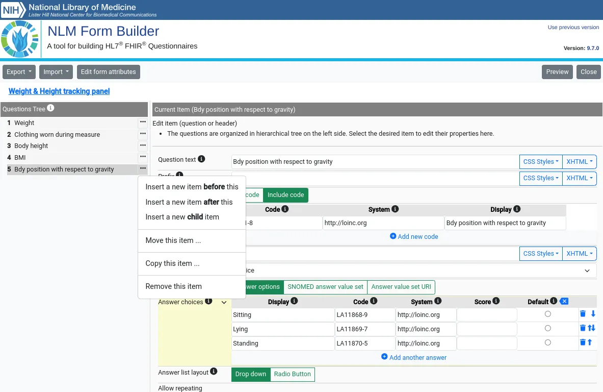 The open source LHC FHIR Tools by the National Library of Medicine (LHNCBC) are a great resource for beginning your FHIR Questionnaire exploration. Here I’m using the LHC-Forms Widget that renders FHIR Questionnaire resources, and looking at the ‘Weight height tracking panel’ sample form provided.