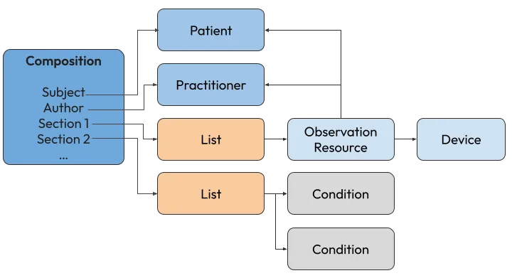 This is how a Composition can be visualized. This image is sourced from the blog Hay on FHIR